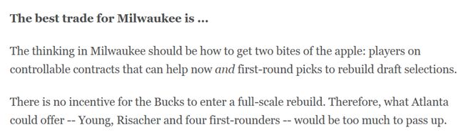 雄鹿队完全没有必要开启彻底重建,因此老鹰队给出的报价——特雷-杨、里萨谢再加上四个首轮签,实在让人难以拒绝。